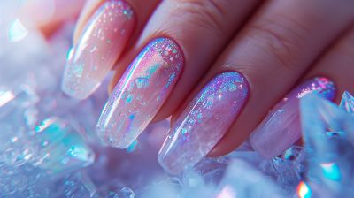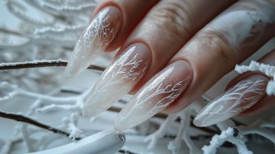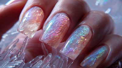 Transparente, perlmuttige oder holografische Lacke erzeugen einen Look wie gefrorenes Wasser oder gläserne Zapfen. Dieser Stil lebt von Licht, das sich darin bricht und je nach Bewegung anders schimmert. Die Designs können sehr natürlich wirken, aber auch glamourös, wenn kleine Steinchen oder Folien eingesetzt werden. Eine schöne Option für alle, die ein winterliches, aber nicht zu weihnachtliches Nageldesign möchten.